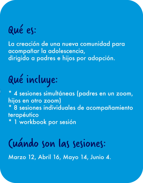 Somos una comunidad de profesionales de la salud mental especializados en adopción que busca acompañar a las familias en los diferentes procesos que se presentan a lo largo del ciclo vital adoptivo.